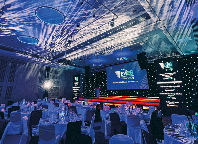 The EVIE Award Ceremony was hosted on the same evening, 15 minutes away, at Leonardo Royal London St Pauls. The awards took place on a bespoke 10M by 4M stage with backlit frosted steps. They used an in-house projector for the main screen which we supplemented with two LED totems either side for sponsorship